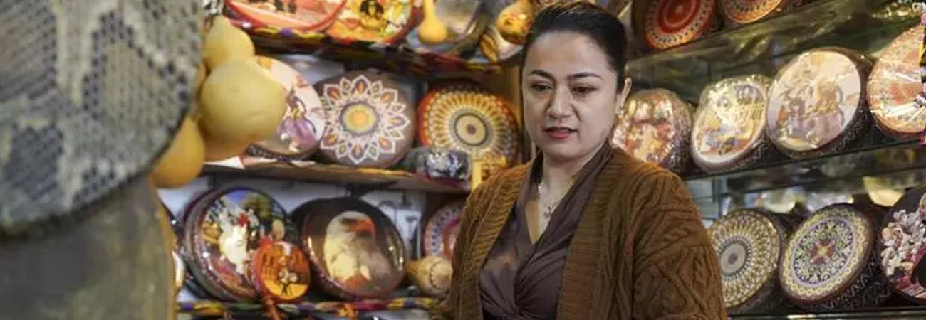 چین ، شمال مغربی سنکیانگ ویغور خوداختیار خطے کے شہر ارمچی کے گر ینڈ بازار میں مائرہ ابلیتی اپنے نسلی موسیقی آلات کی دکان پر سامان ترتیب سے رکھ رہی ہے۔(شِںہوا)