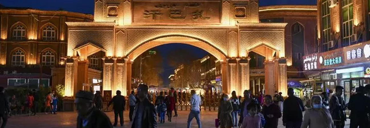 چین ، شمال مغربی سنکیانگ ویغور خوداختیار خطے کے قدیم شہر کاشغر کے خان بازار میں رات کا منظر۔(شِںہوا)