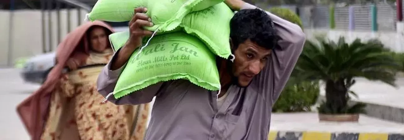 پشاور ، ایک شخص سرکاری مرکز سے مفت آٹے کے تھیلے لیکر جارہا ہے۔(شِنہوا)
