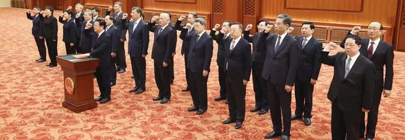 چین ، دارالحکومت بیجنگ میں ریاستی کونسل کے وزراء ، کمیشنز کے سربراہان، مرکزی بینک کے گورنر اور آڈیٹر جنرل آئین سے وفاداری کا عہد کررہے ہیں۔ (شِنہوا)