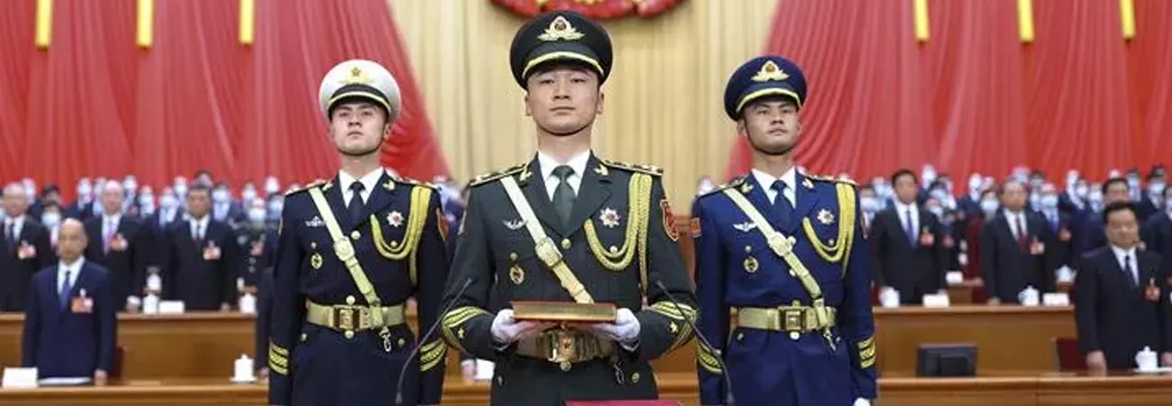 چین کے دارالحکومت بیجنگ کے عظیم عوامی ہال میں آئین سے وفاداری کا عہد کرنے کی غرض سے نومنتخب چینی رہنماؤں کے لیے تقریب کے دوران چینی پیپلز لبریشن آرمی (پی ایل اے) کا گارڈ آف آنر ملکی آئین کی دستاویزلے کر  پیش کر رہا ہے۔(شِنہوا)
