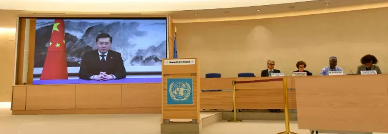 چینی وزیر خارجہ چھن گانگ (اسکرین پر) ، سوئٹزرلینڈ کے شہر جنیوا میں اقوام متحدہ کی انسانی حقوق کونسل کے 52ویں اجلاس سے ویڈیو خطاب کرتے ہوئے۔(شِنہوا)