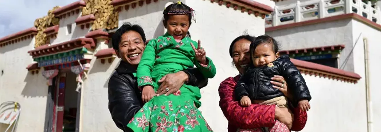 چین کے جنوب مغربی تبت خوداختیار خطے کے  لہاسا کے گورم قصبے میں مقامی باشندوں کا اپنے نئے گھر کے باہر تصویر کیلئے  ایک انداز ۔ (شِنہوا)