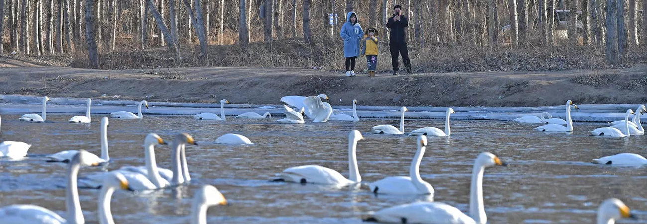 چین، شمال مشرقی صوبہ لیاؤننگ کے شہر بائی پیاؤ کے قصبے باجیازی کے گاؤں ہونگ کن میں سیاح ہنس کو دیکھ رہے ہیں۔(شِںہوا)