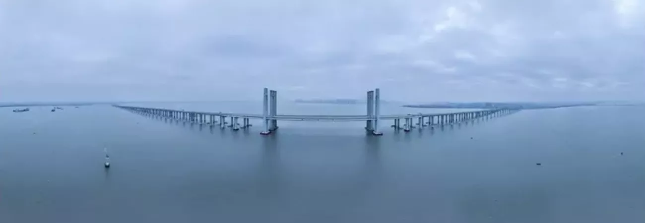 چین،  مشرقی  صوبہ فوجیان میں فو ژو۔شیامن  ہائی اسپیڈ ریلوے کے ایک حصہ میں چھوان ژو بے سمندر پار  پل کا ایک منظر دیکھا جا سکتاہے۔(شِنہوا)