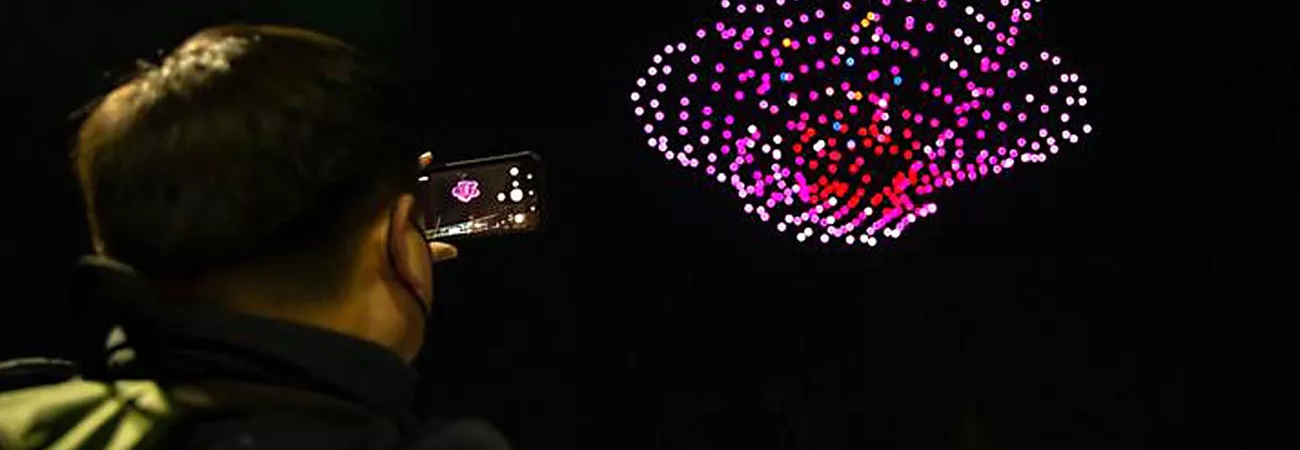 جنوبی کوریا، بوسان میں ایک شخص بوسان ایگزیبیشن اینڈ کنونشن سینٹر پر ڈرون لائٹ شو کی ویڈیو ریکارڈنگ کررہا ہے۔ (شِںہوا)