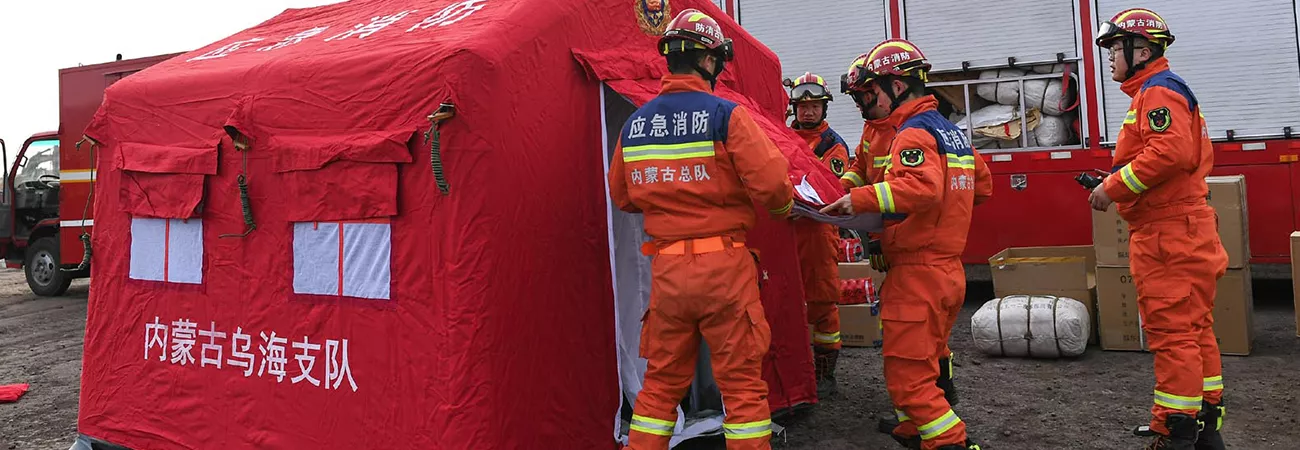 چین کے شمالی اندرونی منگولیا خود مختار علاقےکے الکسا لیگ میں کوئلے کی منہدم ہونے والی کان کے مقام پر امدادی کارکن جمع ہیں۔(شِنہوا)