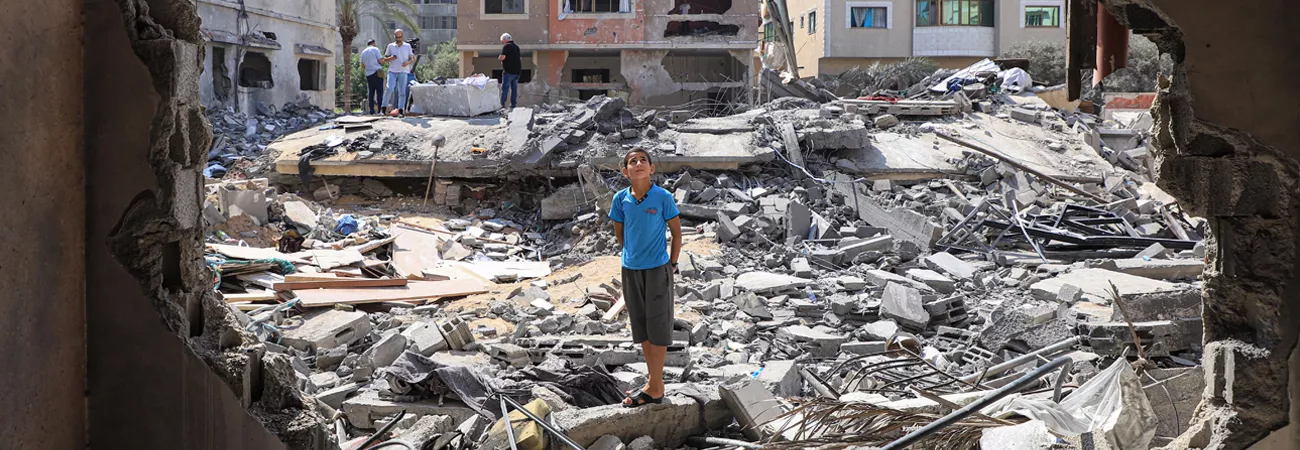 یک فلسطینی لڑکا غزہ شہر میں اسرائیلی فضائی حملے سے تباہ حال اپنے گھر کے ملبے پر کھڑا ہے۔(شِنہوا)