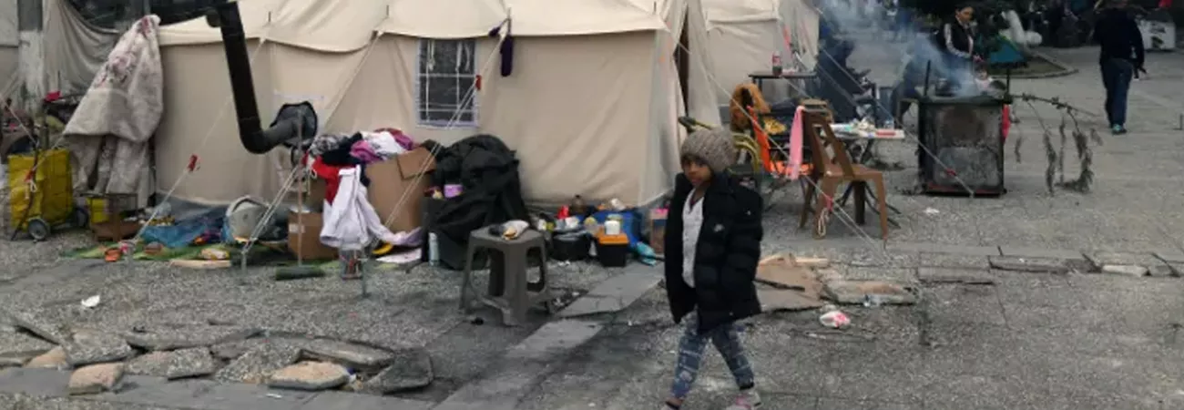 ترکیہ، ایک بچہ زلزلے سے متاثرہ  ہاتے میں خیموں کے قریب سے گزر ر ہا ہے۔(شِنہوا)