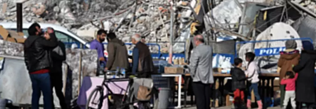 ترکیہ کے زلزلے سے متاثرہ شہر آدیامن میں ایک تباہ شدہ عمارت کے ملبے کے قریب لوگ کھڑے ہیں۔(شِنہوا)