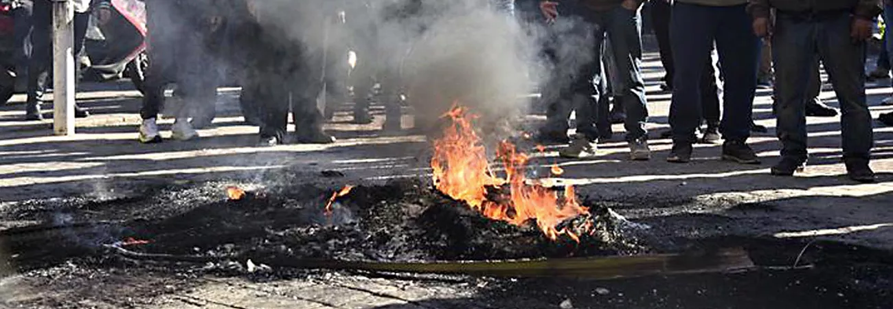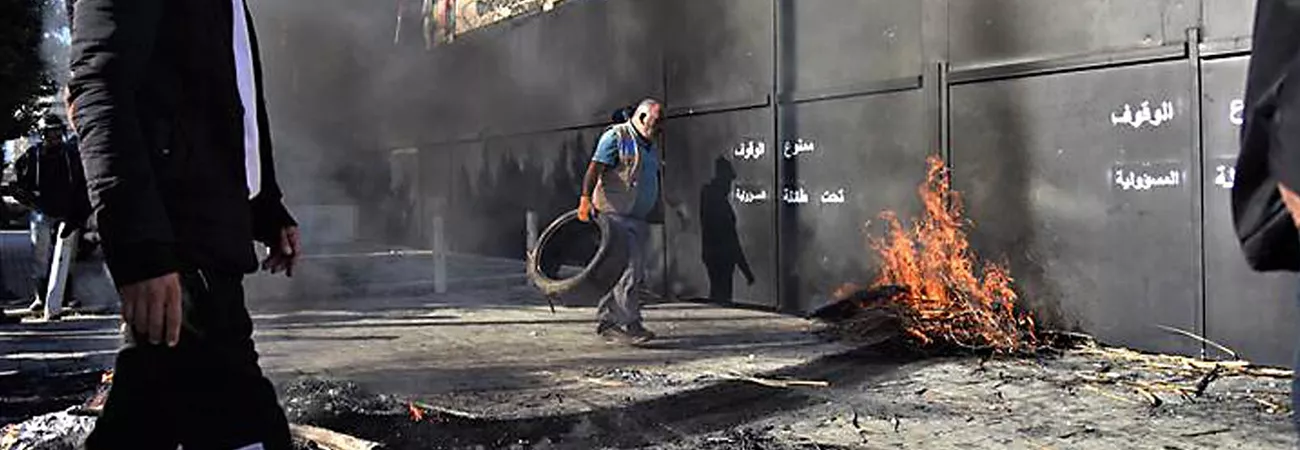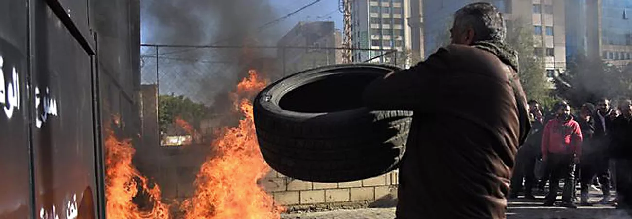 لبنان میں اشیاءصرف کی قیمتوں میں استحکام اورحالات زندگی بہتر بنانے  کے حق میں ایک مظاہرے کے دوران طرابلس میں بینک آف لبنان کے سامنے ایک شخص ٹائر جلانے کی تیاری کر رہا ہے۔(شِنہوا)