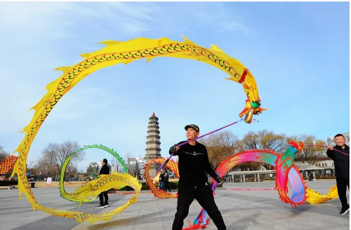 چین، مشرقی صوبہ شان ڈونگ کے شہر تینگ ژو کے ایک چوک میں لا نگ ٹائی ٹو دن کی مناسبت سے لوگ فن کا مظاہرہ کررہے ہیں۔(شِںہوا)