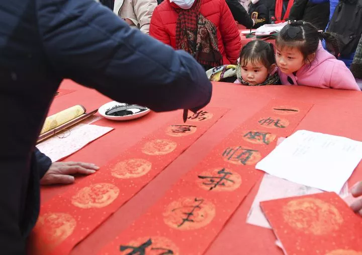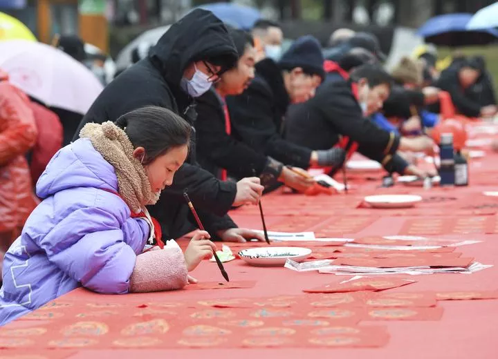 چین، جنوب مغربی چھونگ چھنگ کے ضلع یونگ چھوان میں موسم بہارتہوار کی مناسبت سے منعقدہ خطاطی کی سرگرمی میں لوگ شریک ہیں۔ (شِںہوا)