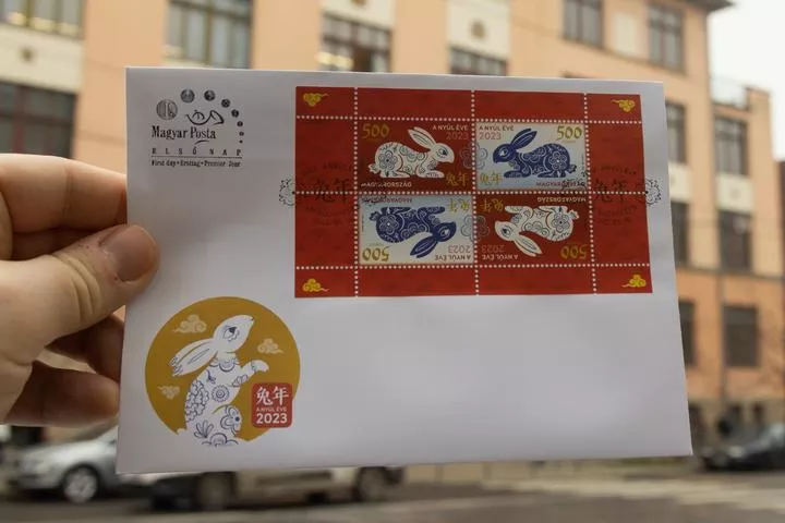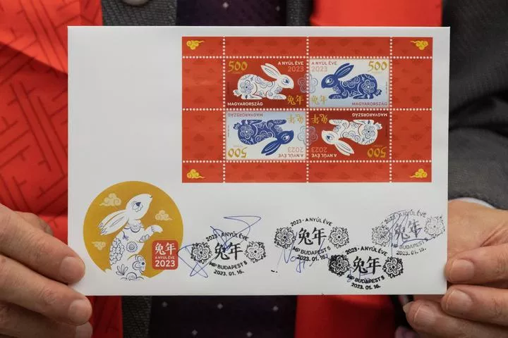 ہنگری، بڈاپسٹ میں خرگوش کے سال کی مناسبت سے جاری ہونے والے ڈاک ٹکٹ کے پہلے دن کے سرورق کو دیکھا جاسکتا ہے۔ (شِنہوا)