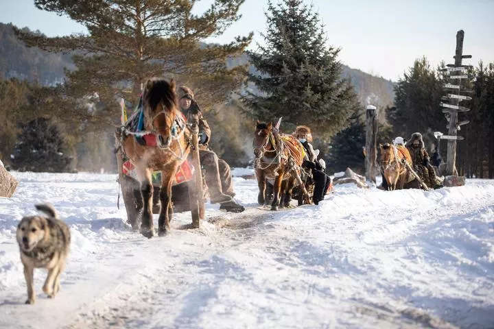 چین، شمال مشرقی صوبہ حئی لونگ جیانگ کے  گاؤں بی جی میں سیاح برف پر چلنے والی گھوڑا  گاڑی کی سواری کررہے ہیں۔(شِنہوا)