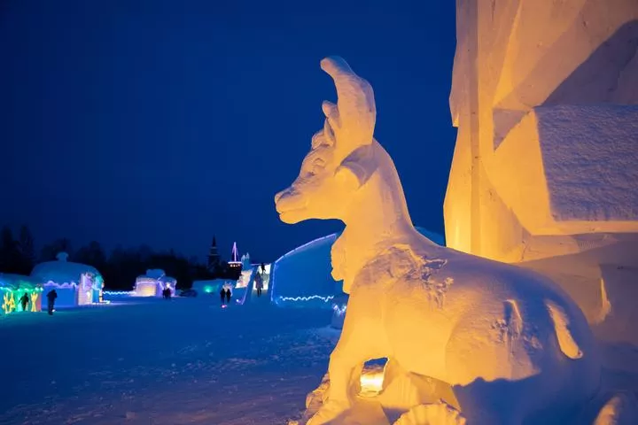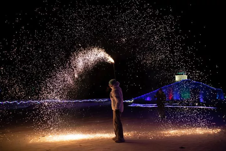 چین، شمال مشرقی صوبہ حئی لونگ جیانگ کے شہر موہی کے گاؤں بی جی میں آئس اینڈ اسنو پارک کا رات میں دلکش نظارہ ۔(شِنہوا)