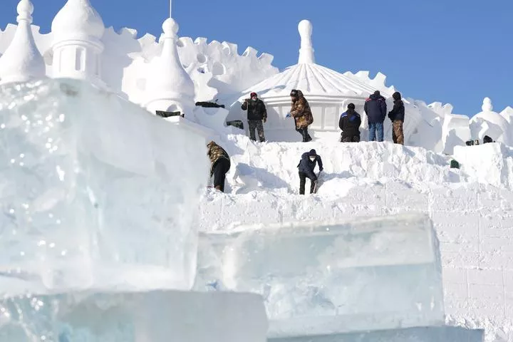 چین کے شمال مشرقی صوبہ حئی لونگ جیانگ کے ہاربن میں عملہ کے اراکین برفانی مجسموں کی 35 ویں تائی یانگ داؤ آئلینڈ بین الاقوامی نمائش کیلئے ایک دیوقامت برفانی مجسمہ تیار کر رہے ہیں۔(شِنہوا)