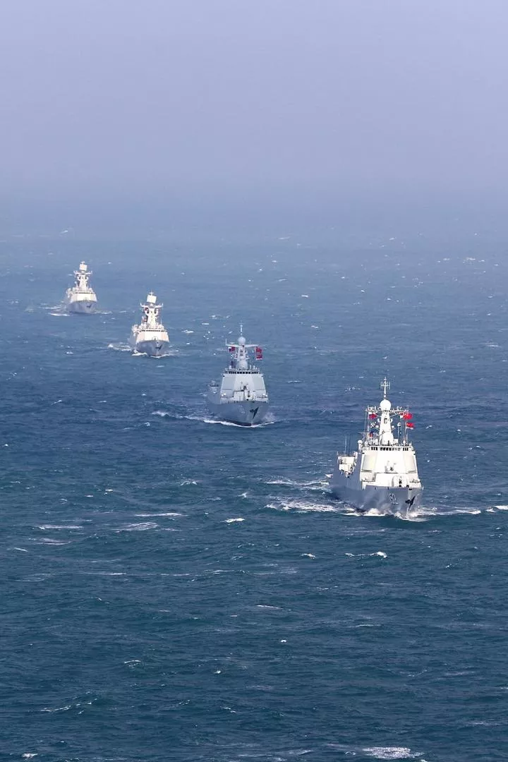 بحیرہ مشرقی چین میں چینی بحریہ کے جنگی جہاز مشترکہ بحری  مشقوں میں حصہ لے رہے ہیں۔(شِنہوا)