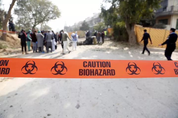 اسلام آباد میں سیکورٹی اہلکاروں نے خودکش حملے کی جائے وقوعہ کو گھیرے میں لے رکھا ہے۔(شِنہوا)