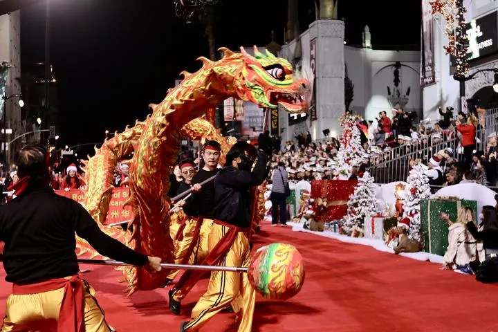 امریکہ کے لاس اینجلس میں 90 ویں ہالی ووڈ کرسمس پریڈ میں چین کے ڈریگن ڈانس کا مظاہرہ کیا جا رہا ہے۔(شِنہوا)