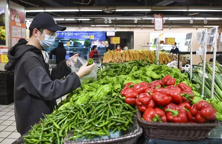 چین ، جنوب مغربی چھونگ چھنگ کی ایک سپرمارکیٹ میں گاہک سبزیاں چُن رہا ہے۔(شِنہوا)