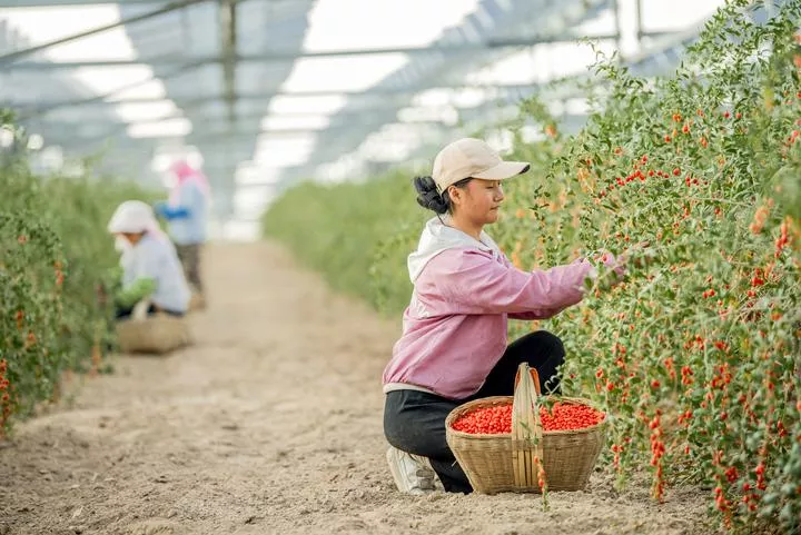 چین، شمال مغربی ننگ شیا ہوئی خوداختیار خطے  میں باؤفینگ فارمنگ لائٹ انٹی گریٹیڈ فوٹو ولٹک پاوراسٹیشن میں سولر پینلز کے نیچے اگنے والی گو جی بیریز کو محنت کش خواتین چن رہی ہیں۔ (شِنہوا)