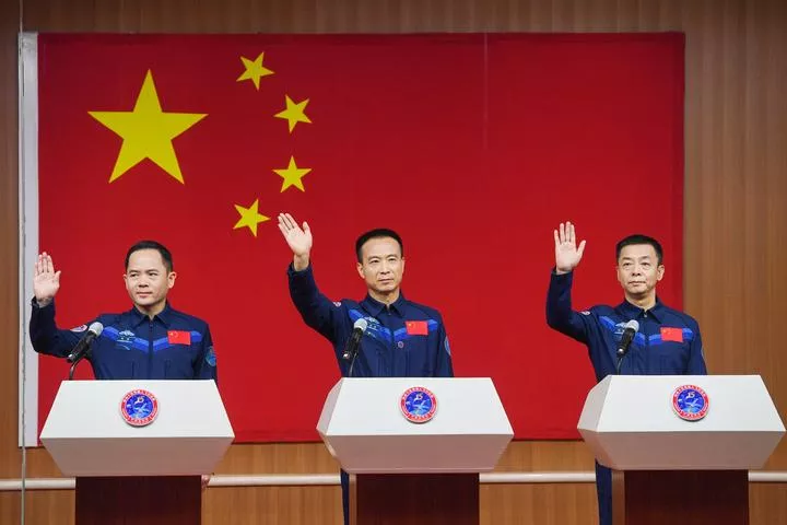 چین ، شمال مغرب میں واقع جیوچھوان سیٹلائٹ لانچ مرکز میں آمدہ شین ژو- 15 مشن کے 3 چینی تائی کوناٹس فائی جن لونگ (درمیان) ڈینگ چھنگ منگ (دائیں) اور ژانگ لو میڈیا سے گفتگو کررہے ہیں۔ (شِنہوا)