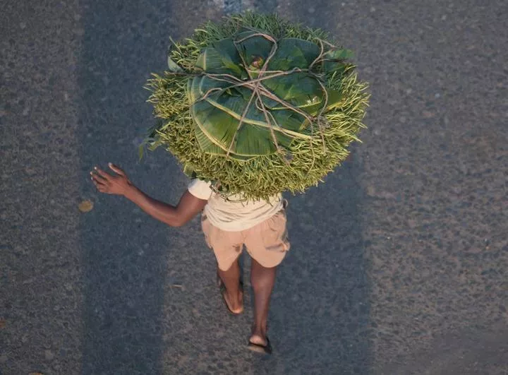 بھارت ، شمال مشرقی ریاست تریپورہ کے دارالحکومت اگرتلہ میں مزدور تھوک مارکیٹ سے پان کے پتے لیکر   کر یا نہ اسٹور جا رہے ہیں۔ (شِنہوا)