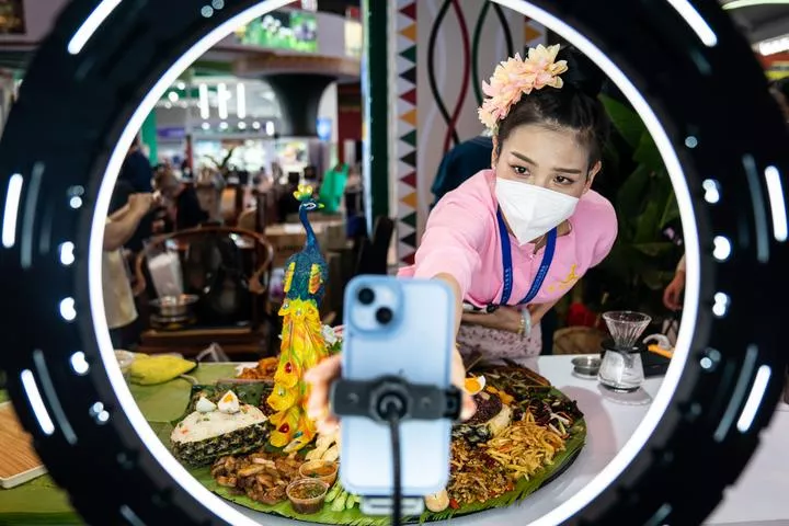 چین ، جنوب مغربی صوبہ یون نان کے شہر کن منگ میں منعقدہ چھٹی چین ۔ جنوبی ایشیا نمائش میں ایک نمائش کنندہ لائیو اسٹریمنگ کی مدد سے مصنوعات کی تشہیر کررہی ہے۔ (شِنہوا)