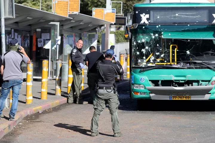 بیت المقدس میں بس اسٹاپ پر دھماکہ کے بعد اسرائیلی پولیس اہلکار جائے وقوعہ کا معائنہ کر رہے ہیں۔(شِنہوا)