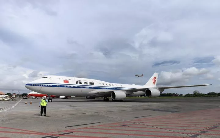 انڈونیشیا کے بالی میں گروپ آف 20 (جی 20) کی 17 ویں سربراہی کانفرنس میں شرکت کیلئے آمد کے موقع پر چین کے صدر شی جن پھنگ کا طیارہ ایئرپورٹ پر لینڈ کر رہا ہے۔(شِنہوا)
