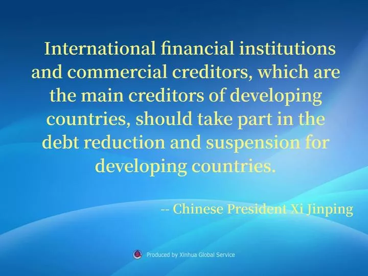 شی جن پھنگ نے کہا کہ چین جی 20 کے قرض ادائیگی معطلی اقدام کو ہر اعتبار سے نا فذ کررہا ہے اور اس نے جی 20 ارا کین میں سے قرض کی سب سے بڑی رقم کی ادائیگی کو معطل کردیا ہے۔