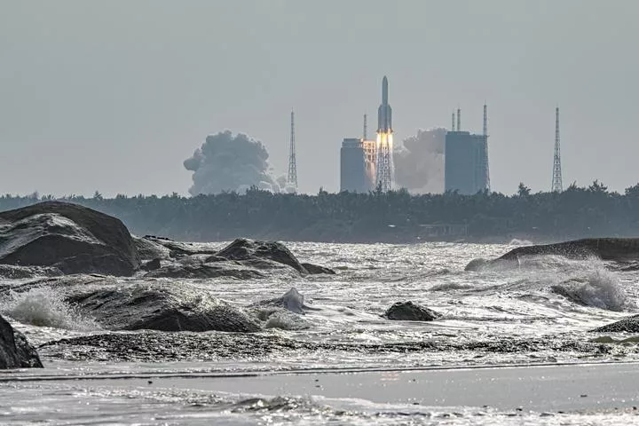 چین کے جنوبی ہائی نان میں وین چھانگ سپس کرافٹ لانچ سائٹ سے ایک لانگ مارچ 5 بی وائے 4 مال بردار راکٹ کے ذریعے سپیس لیب ماڈیول مینگ تیان کو خلا میں بھیجا جا رہا ہے۔(شِنہوا)