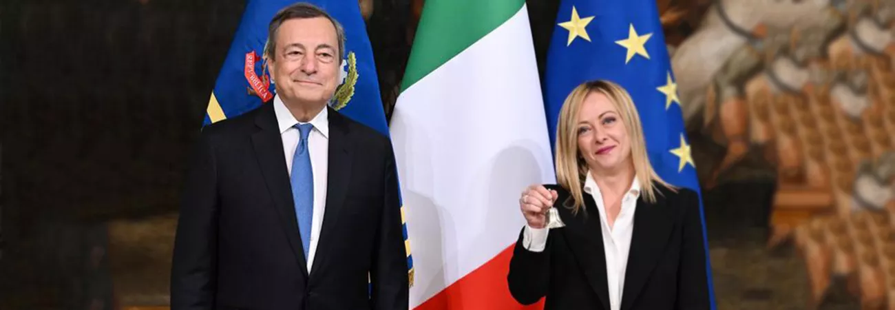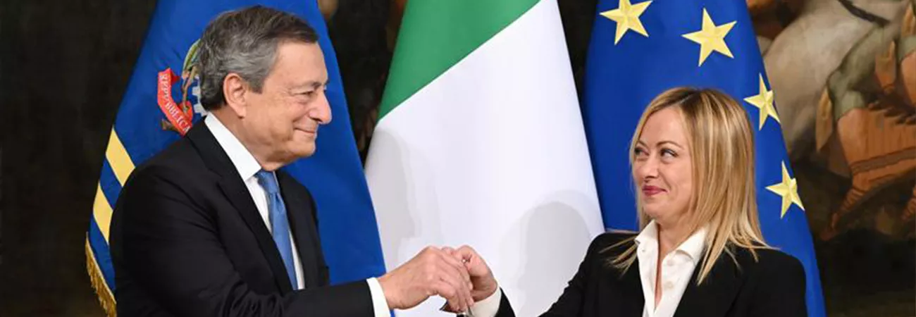 اٹلی کے روم میں اقتدار منتقلی کی تقریب کے دوران نئی اطالوی وزیراعظم جارجیا میلونی(دائیں) سبکدوش ہونیوالے وزیراعظم ماریو دراگئی کی جانب سے سپرد کی جانیوالی گھنٹی دکھا رہی ہیں۔(شِنہوا)