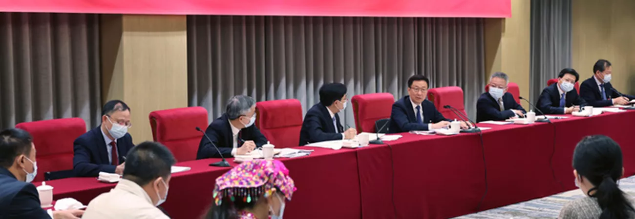 ہان ژینگ بیجنگ میں منعقدہ کمیونسٹ پارٹی آف چائنہ کی 20 قومی کانگریس میں شرکت کرنے والے چین کے جنوبی صوبہ ہائی نان کے مندوبین کے ساتھ گروپ مباحثے میں شریک ہیں۔ (شِنہوا)