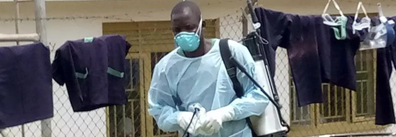 یوگنڈا کے ضلع موبیندے کے علاقائی ہسپتال میں ایبولا علاج کے مرکز میں طبی اہلکار جراثیم کشی کرنے کے بعد واپس آ رہا ہے۔(شِنہوا)