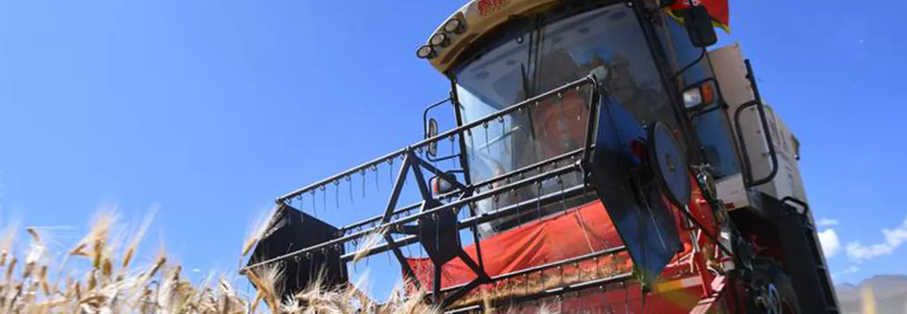 چین کے جنوب مغربی تبت خوداختیار خطے کے شی گازا کی کاؤنٹی گیانگ زی کے راسوگ قصبے میں جو کے کھیت میں ایک ہارویسٹر کام کررہا ہے۔ (شِنہوا)