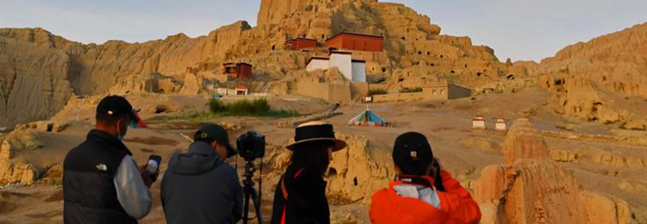 چین کے جنوب مغربی تبت خوداختیار خطے کے ناگری پریفیکچر کی زینڈا کاؤنٹی میں سیاح گیوگ سلطنت کے کھنڈرات کی تصاویر بنا رہے ہیں۔ (شِنہوا)