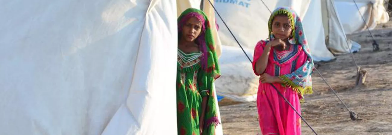 حیدرآباد کے نواح میں قائم عارضی خیمہ بستی میں سیلاب سے متاثرہ بچوں کو دیکھا جاسکتا ہے۔ (شِنہوا)