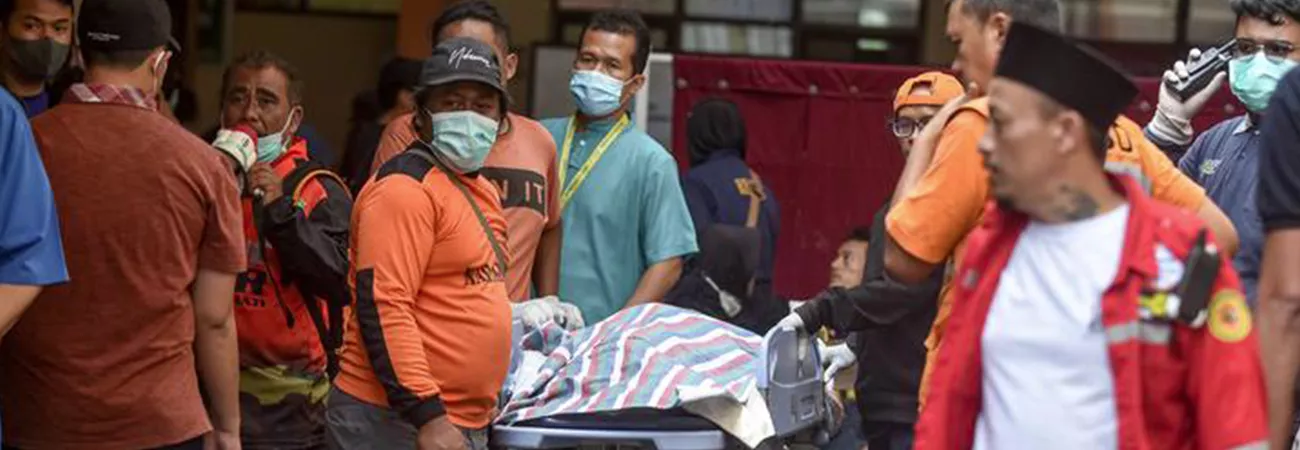 انڈونیشیا ، مشرقی جاوا کے مالانگ کے ایک ہسپتال میں فٹبال میچ میں بھگڈر مچنے سے متاثرہ شخص کی لاش کو منتقل کیا جا رہا ہے۔(شِنہوا)