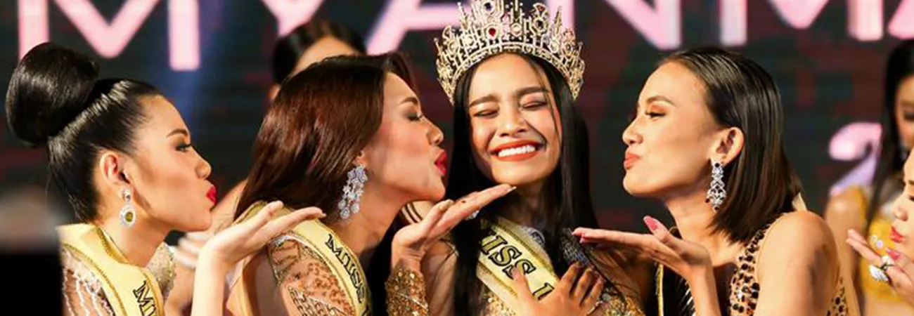 میانمار، ینگون میں منعقدہ مس یونیورس میانمار 2022 مقابلہ جیتنے والی زار لی مو (وسط) کا دیگرشرکاء کے ساتھ ایک انداز (شِںہوا)