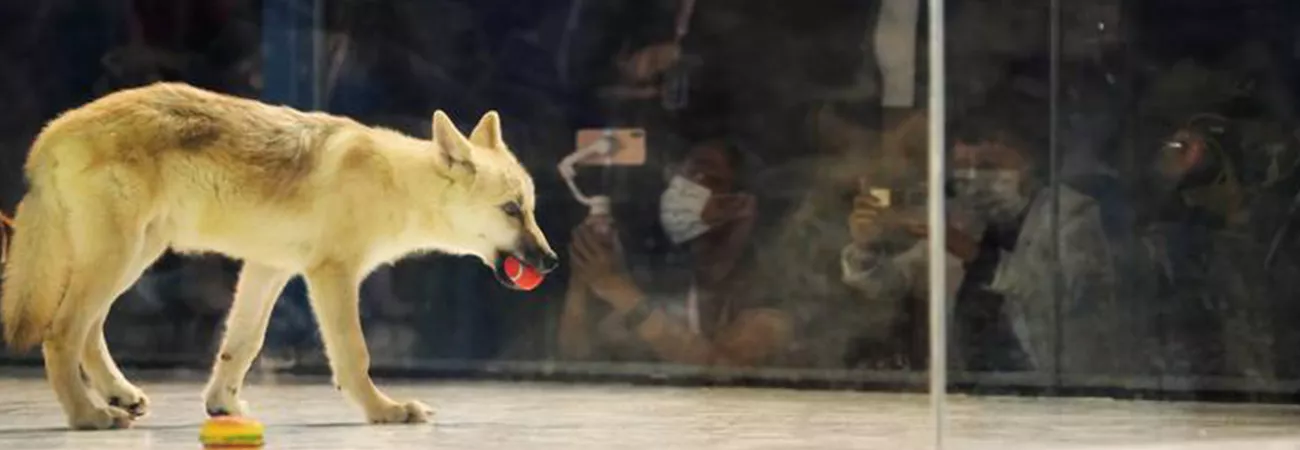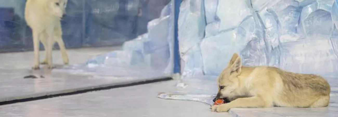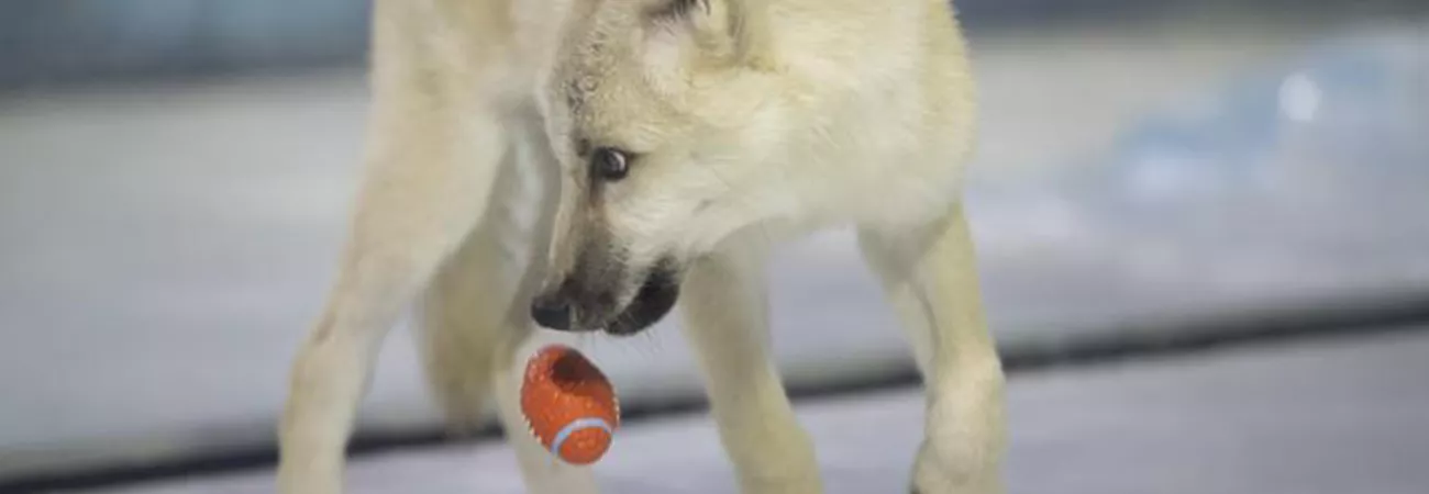 چین کے شمال مغربی صوبہ حئی لونگ جیانگ کے دارالحکومت ہاربن کے ہاربن پولرلینڈ میں ایک کلون برفانی بھیڑیا گیند سے کھیل رہا ہے۔ (شِنہوا)