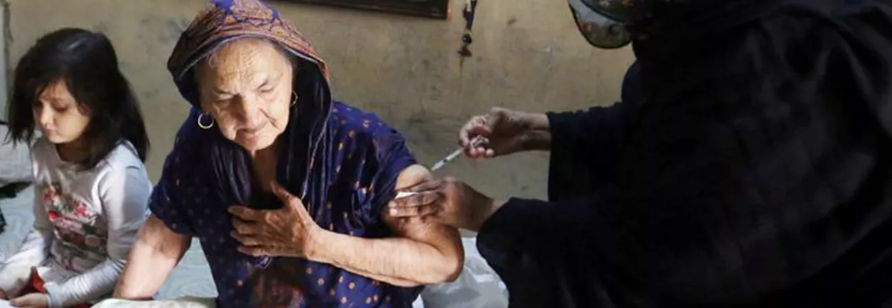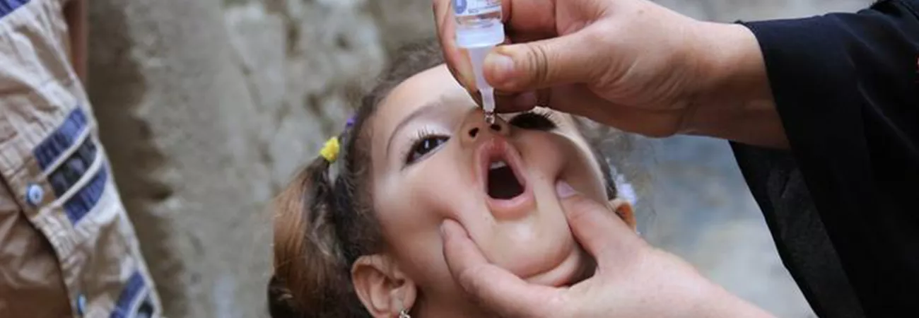افغانستان ، کابل میں طبی کارکن انسداد پولیو ویکسی نیشن مہم کے دوران ایک بچے کو پولیو ویکسین پلارہی ہے۔ (شِنہوا)