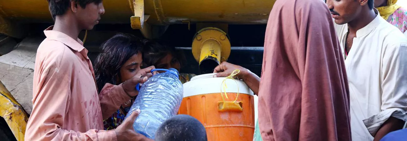 حیدرآباد کے نواح میں سیلاب متاثرین پانی کے ایک ٹینکر سے پانی حاصل کررہے ہیں۔ (شِنہوا)