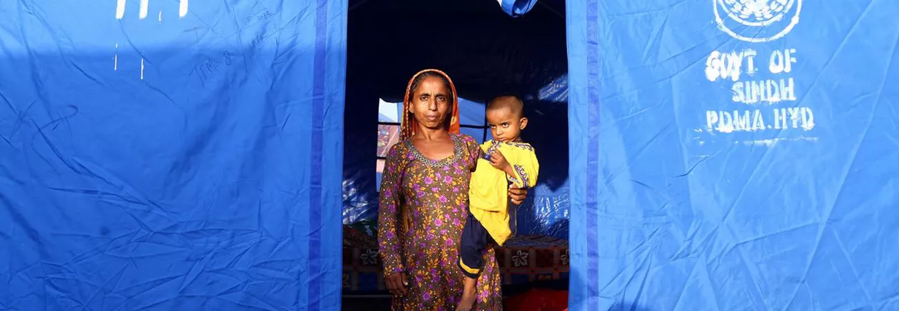 حیدرآباد کے نواح میں قائم خیمہ بستی میں سیلاب سے متاثرہ خاتون کو اپنے بچے کے ساتھ دیکھا جاسکتا ہے۔ (شِنہوا)