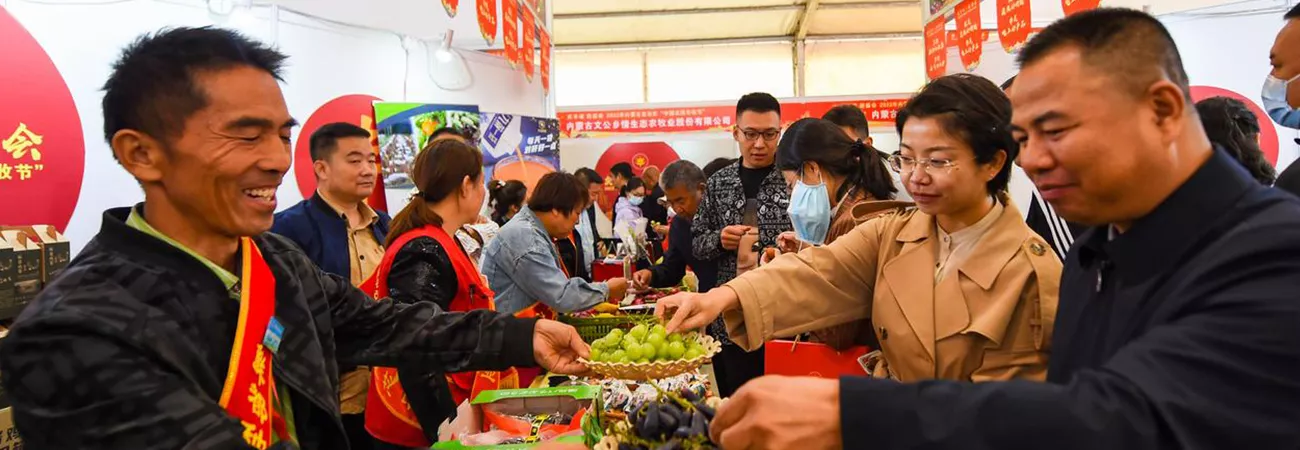 چین کے اندرون منگولیا خوداختیار خطے کے شہر ہوہوٹ میں آمدہ چینی کسانوں کے کٹائی میلے کے جشن کے دوران لوگ انگور چکھ رہے ہیں۔ (شِںہوا)