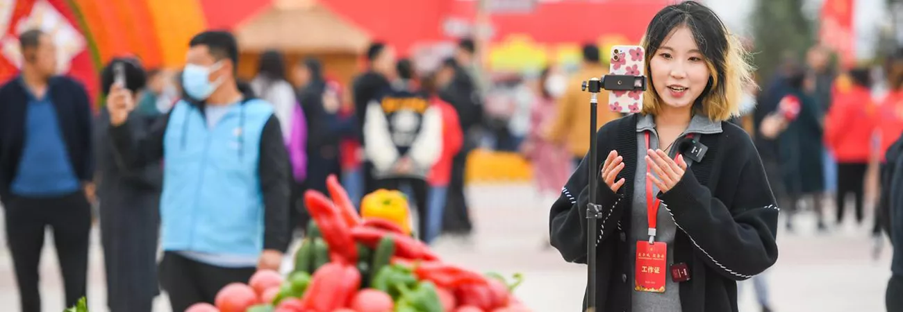 چین کے اندرون منگولیا خوداختیار خطے کے شہر ہوہوٹ میں آمدہ چینی کسانوں کے کٹائی میلے کے جشن کی سرگرمیوں کو ایک خاتون لائیو اسٹریمنگ کے ذریعے نشرکررہی ہے۔ (شِںہوا)