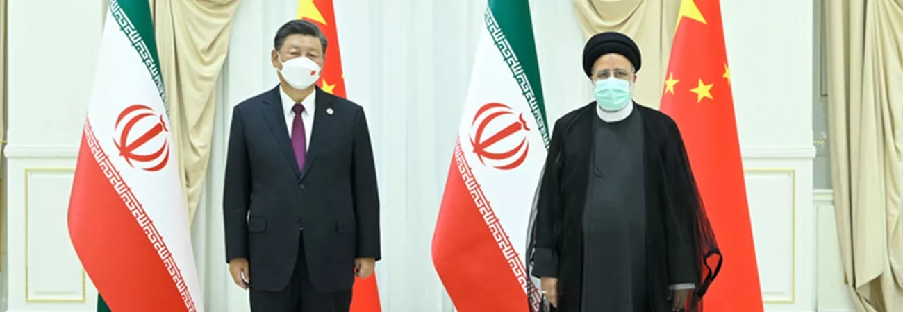 ازبکستان کے سمرقند میں چین کے صدر شی جن پھنگ اور ایران کے صدر ابراہیم رئیسی فورملر مج مواسی کمپلیکس میں ملاقات کے بعد تصویر بنوا رہے ہیں۔(شِنہوا)