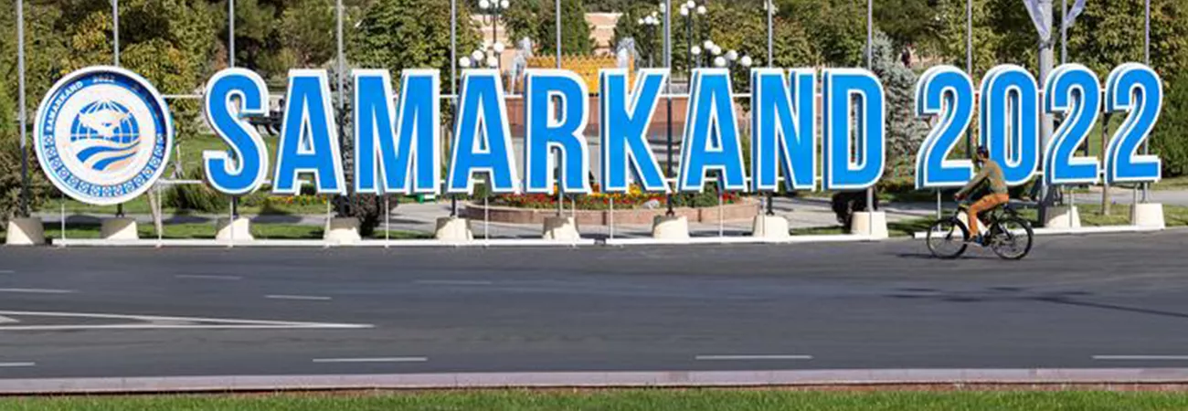 ازبکستان، ثمرقند میں شنگھائی تعاون تنظیم کے 22 ویں سربراہ اجلاس کے لوگو کے سامنے سے ایک شخص گزررہا ہے۔ (شِنہوا)