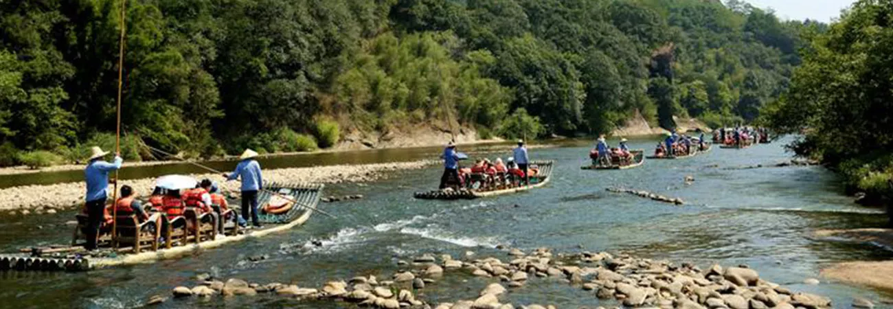 چین کے جنوب مشرقی صوبہ فوجیان کے وئی شان نیشنل پارک میں وسط خزاں تہوار کی تعطیل کے دوران لوگ قدرتی مناظر سے لطف اندوز ہونے کے لئے بانس کے بیڑوں پر جارہے ہیں۔(شِنہوا)
